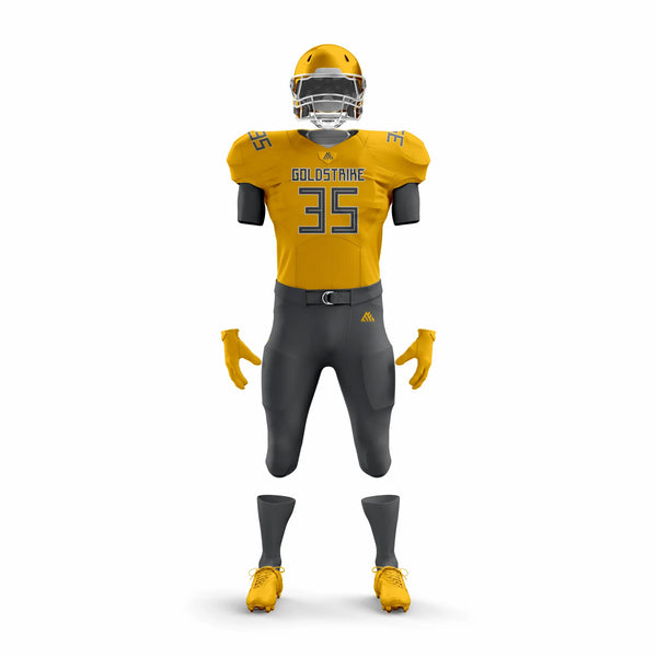 The Gold Strike American Football Uniform delivers unmatched durability, comfort, and style for athletes ready to dominate the game. Built with moisture-wicking, breathable polyester, it keeps players cool and dry under pressure. Reinforced stitching ensures long-lasting toughness, while the bold gold design makes your team shine on the field.